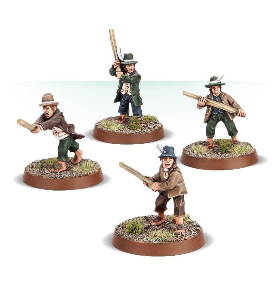 This is a set of metal miniatures which make up 4 Hobbit Shirriffs. Diminutive in stature and barefoot, as expected from Hobbits, each of them is clad in a feathered hat, jacket and waistcoat (1 model has his jacket fastened, with a cravat around his neck) and is carrying a stout club in both hands.
